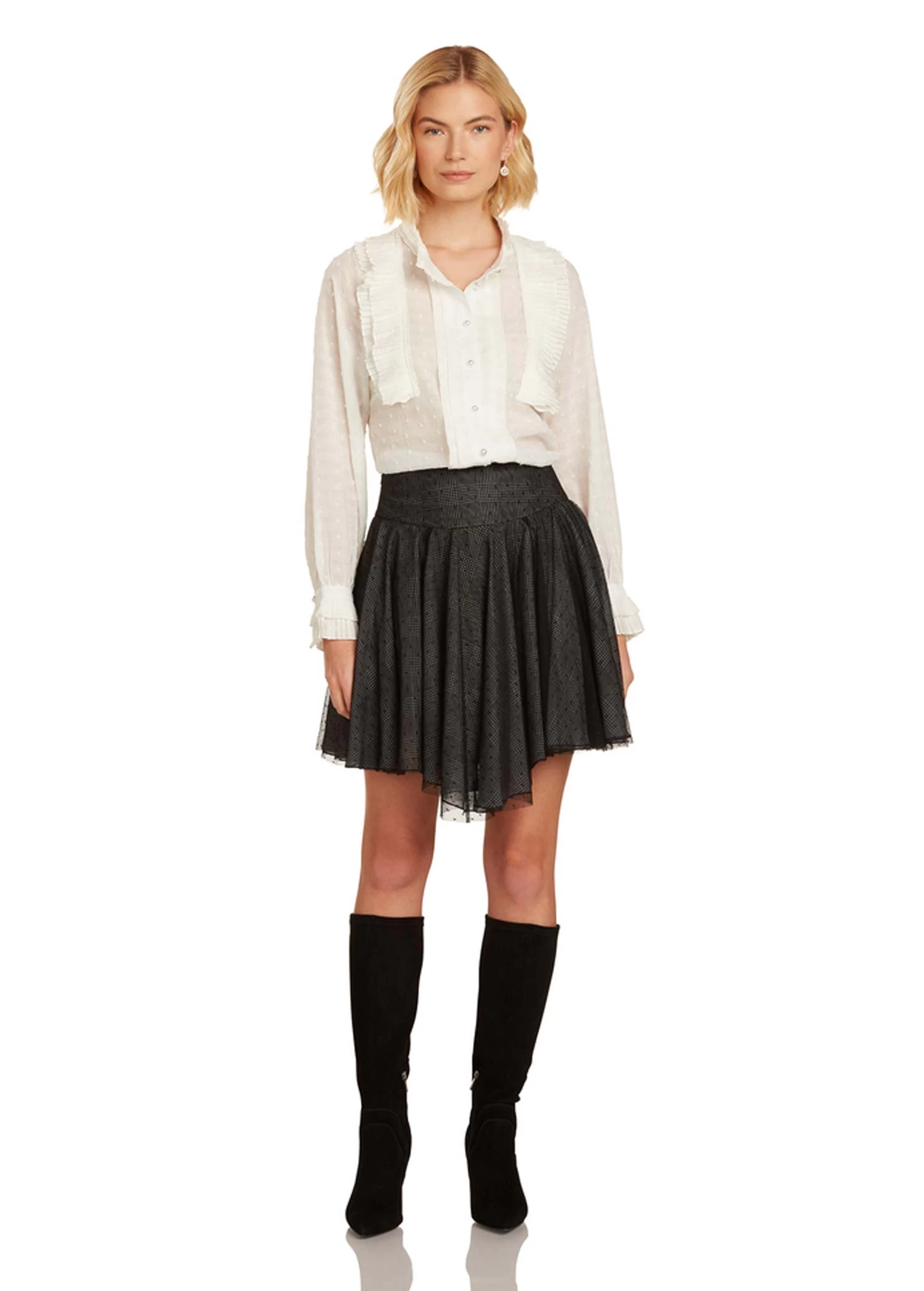 Whirly twirly and sassy is this skirt! A stunning glen plaid fabric is layered with a black dot mesh, for the perfect glam skirt.
