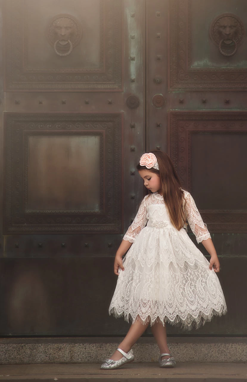 This vintage inspired lace frock is absolutely stunning in person. The color is a dreamy antique white and photographs amazing. The lace is soft, not scratchy and has a French eyelash edging, creating a touch of vintage whimsy. The dress is fully lined with soft cotton and has a back zipper. The sparkle belt is completely removable and self ties in back for just the right amount of glam. This color is gorgeous and will be a photographers dream to shoot. Machine wash, hang dry. WE RECOMMEND REMOVING THE BELT DURING ACTIVE PLAY. THE BELT CAN SNAG ON THE LACE AND CAUSE DAMAGE TO THE DRESS.